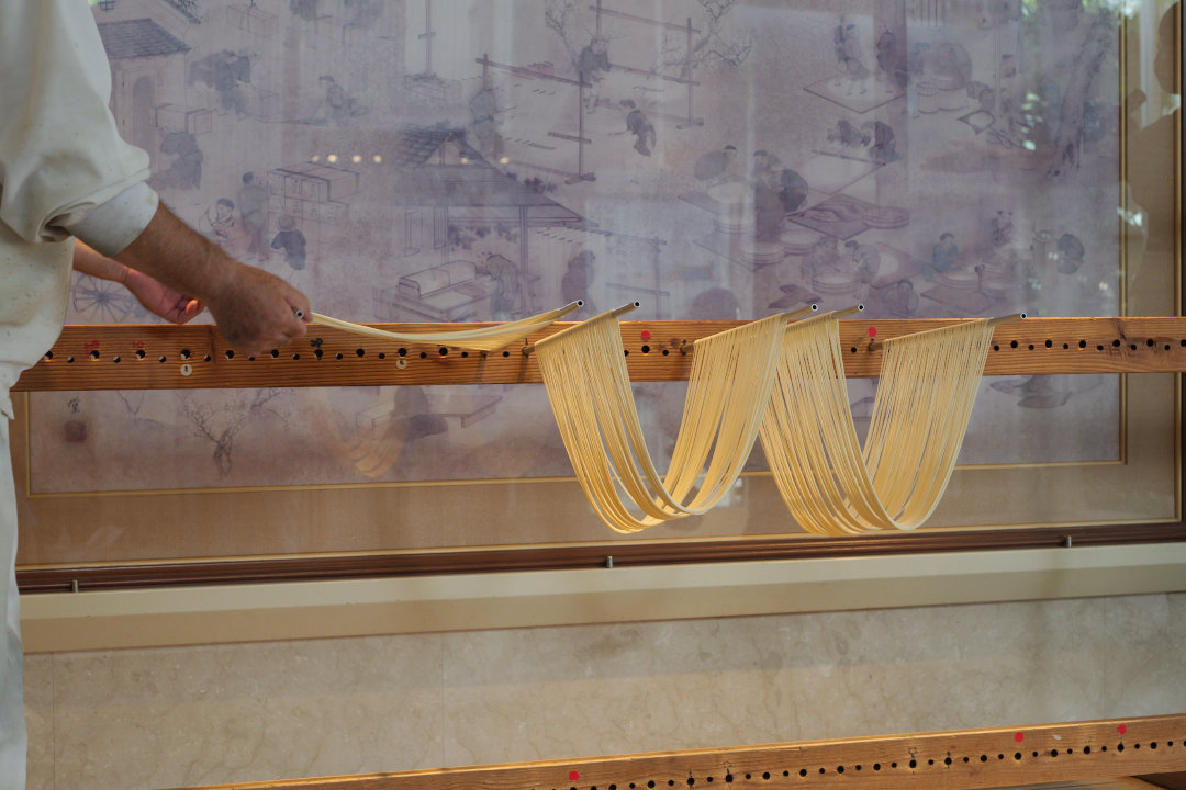 「手延そうめん」というだけあって見事な手さばきでそうめんが細く長く伸ばされていきました、いやーお見事でした。