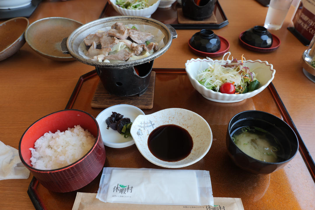 私と妻が選んだのはジンギスカン陶板焼き定食です。ご飯に味噌汁とサラダに漬物が付いています。