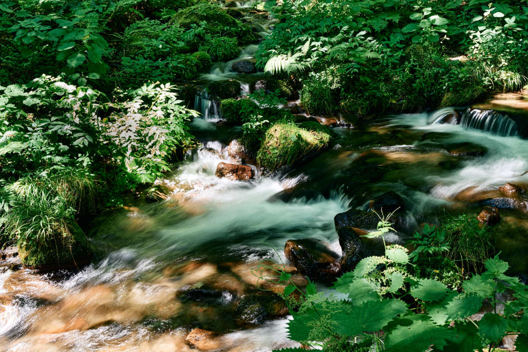 さらに奥に進んでいくと水の流れる音と共に渓流が姿を現します。