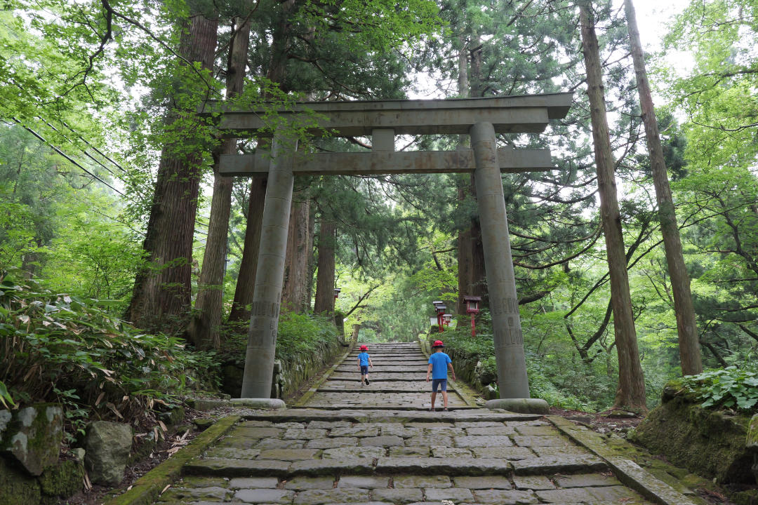 自然石を敷き詰めた参道は約700mで国内最長となっています。石が湿っているので気を付けて歩いていきます。